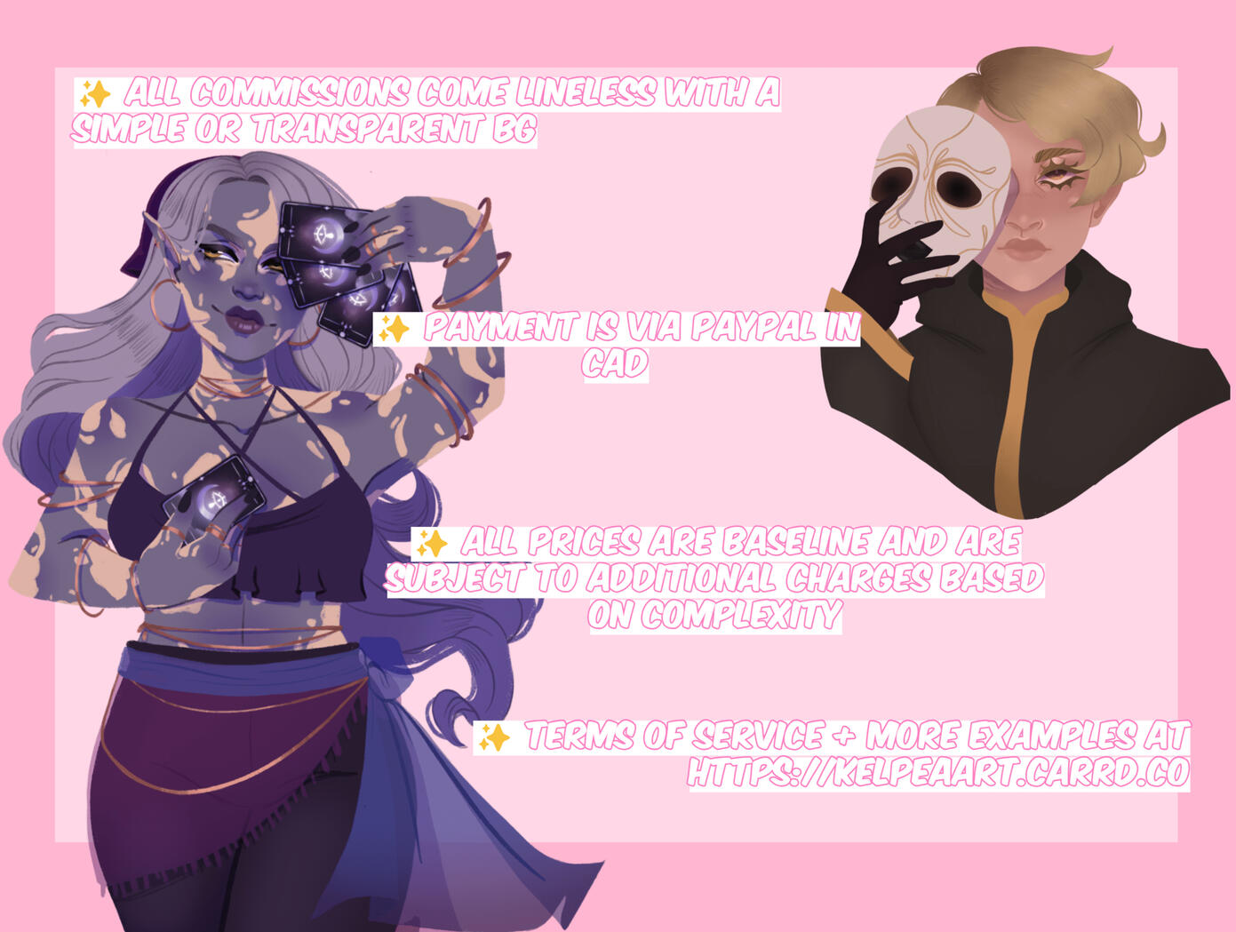 ✨WILL DO: original characters, fan-art, ships, light nsfw/nudity, character designs, real people✨ WILL NOT DO: complicated mech, full anthro/furry (animal features okay), pet portraits, heavy nsfw, replication of another artist's style✨ the rights to all images are reserved by myself and are for your own personal use. you may not make money off of any art commissioned from me -- besides that, it's yours to use how you see fit! if you are reposting it somewhere, credit is appreciated.✨ if you do not want your commission posted publicly/linked back to you, please let me know.✨ if you need to cancel just let me know and we'll figure out a refund depending on how much of the commission has been completed. I also reserve the right to cancel the commission for any reason, and in this case I will offer a 100% refund.✨ payment is through Paypal, in CAD. I do not ask for payment until I've sent you a sketch and had it approved, after that I will not work on the commission until payment is received in full. any major changes must be requested at this stage!✨ prices are a baseline and may increase based on the level of complexity. (i.e a detailed background/several figures/lots of accessories)✨ I really appreciate visual references, the more the better! for description based commissions where I'm doing the work of finding and compiling references I may charge an extra fee.✨ turnaround is a maximum of two months. if there are expected delays I will communicate this with you! if you need the commission by a certain date please let me know beforehand so I can handle it accordingly.✨ your finished commission will be sent at full resolution and without a watermark to the e-mail provided. there will be NO physical copy of the image provided unless it's worked out beforehand.✨ all social media linked is checked regularly, though regardless of where you message me I'll ask you to fill out a google docs link so I have all the information I need in one place!